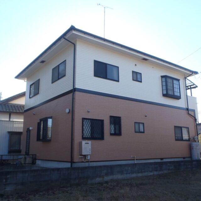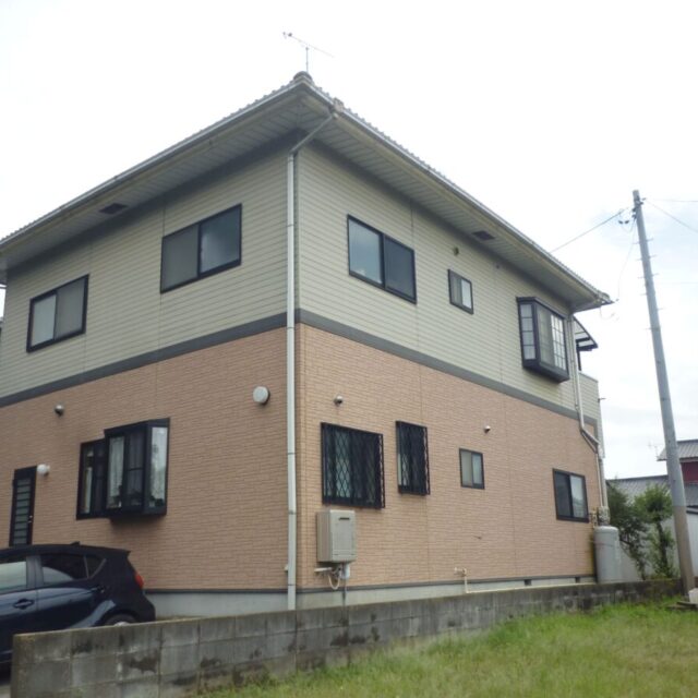 1階部分の暖色系サイディングと2階の明るい色のコントラストが素敵なお住まいですが、経年により雨だれや細かな汚れが目立ち始めていました。