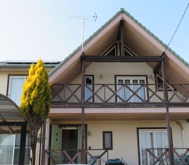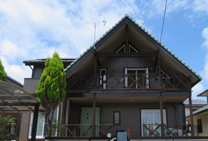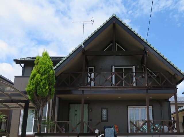 以前の明るいベージュから一転、建物全体を落ち着いたダークトーンで統一しました。傷みが目立っていた木製バルコニーや破風板も、丁寧にケレン・塗装を施すことで、深みのある美しい質感が復活。グリーンの玄関ドアがアクセントとして映える、重厚かつ洗練された外観へと生まれ変わりました。